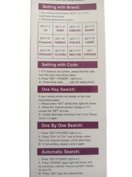 UNIVERSAL REMOTE COMPATIBLE FOR SHARP/TOSHIBA/JVC/PHILIPS/HITACHI/LG/SONY/SAMSUNG/PANASONIC/HAIER/SANYO/TCL/KOKA/WALTON AND OTHER BRANDS.